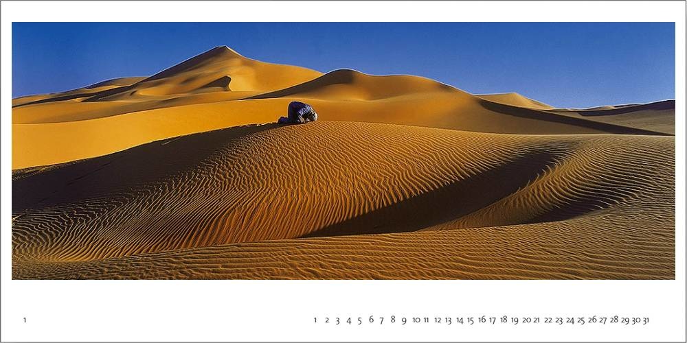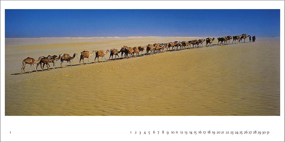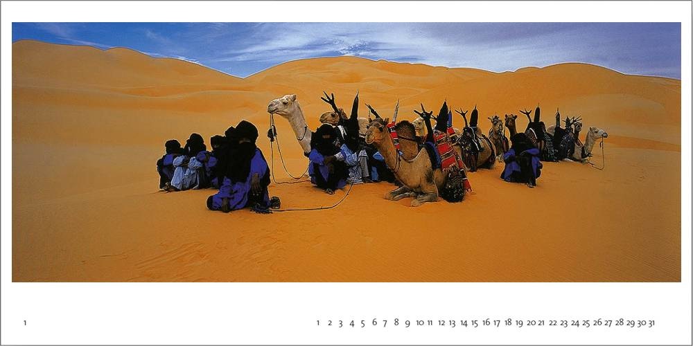 Die endlosen Weiten der Wüste sind geprägt von Sonne und Wind: ockergelbe Dünen und weiße Gipsskulpturen, märchenhafte Oasen, prähistorische Felszeichnungen oder eine Salzkarawane im Ténéré. Das Geheimnis der Wüste liegt wohl in der Beschränkung auf das Elementare. Die Nomaden sagen: „Allah hat aus seinem Garten alles Überflüssige entfernt…“