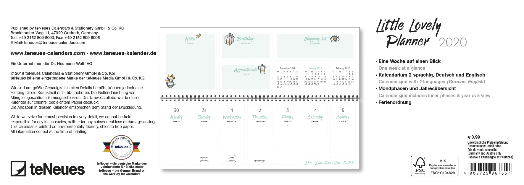 De teNeues desk kalender 2020 in het formaat 29,7 x 10,5 cm is een echte eyecatcher en neemt niet veel ruimte in beslag. Dus de kalender past optimaal bij elke kleine plaats op tafel. De weekkalender 2020 heeft maanstanden, internationale feestdagen en een 2-talige kalender, evenals een decoratieve hanger. Bovendien is de kalender een week op twee pagina's en is daarom heel duidelijk en biedt voldoende ruimte om belangrijke datums en notities in te voeren. Om de kalender te beschermen, is deze verpakt in een polybag.